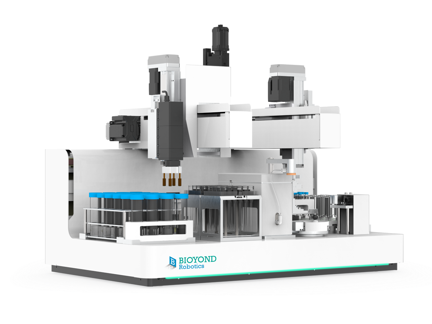 针式过滤助手主要由扫码模块、开关盖模块、移液模块、正压过滤模块,以及样品与耗材存储模块组成,能够自动化执行瓶身的扫码、开关盖、移液和正压过滤操作。