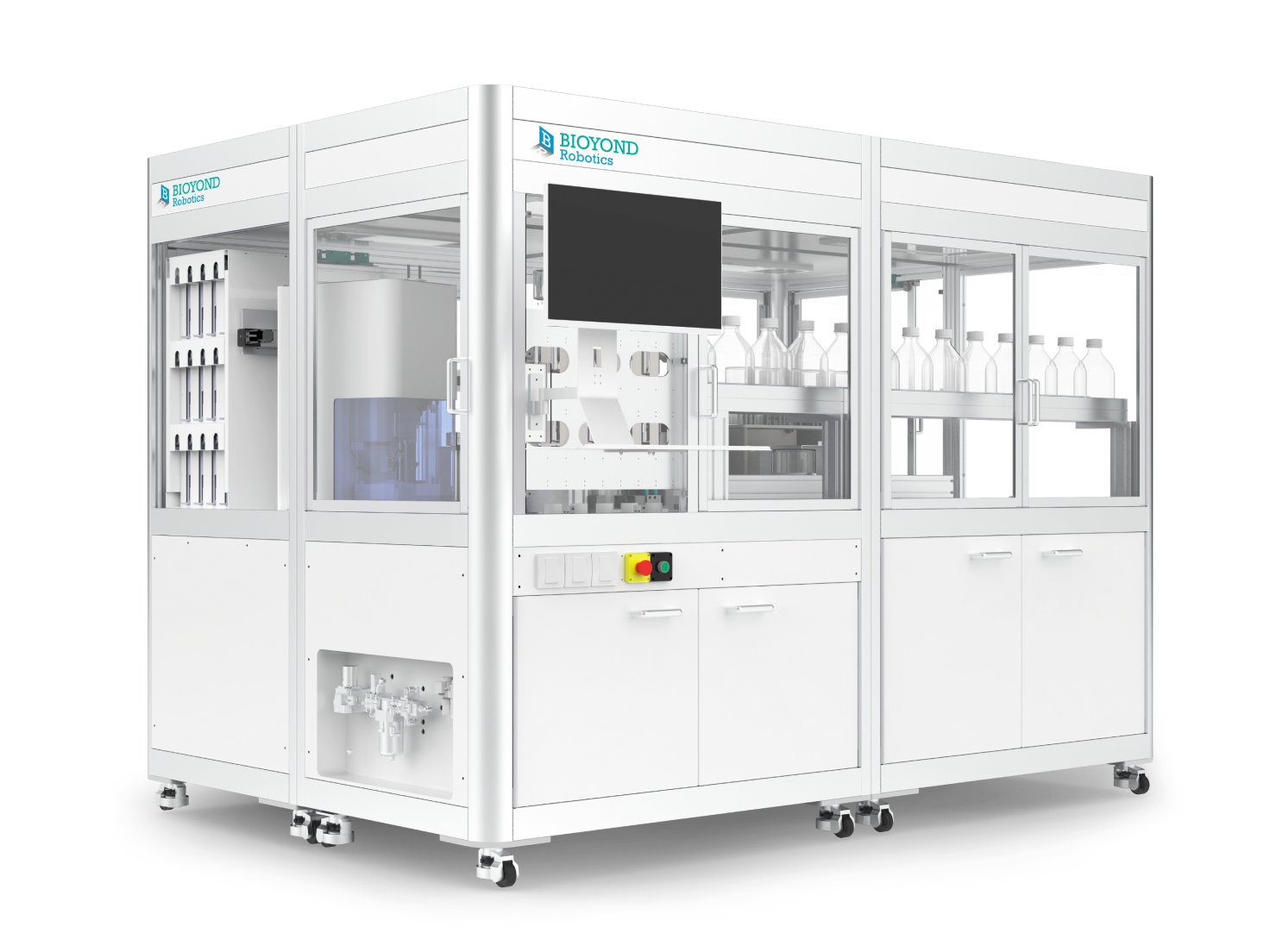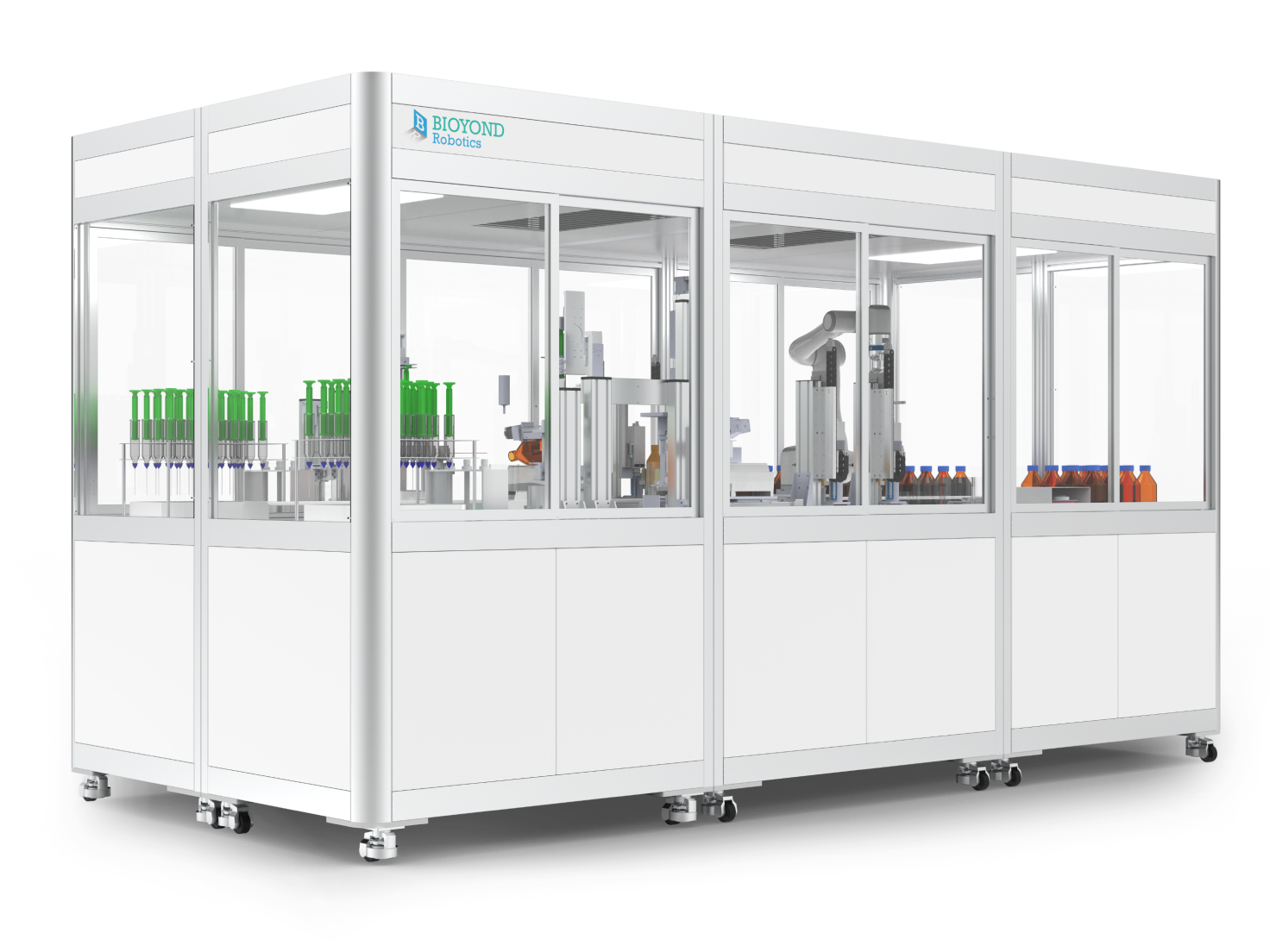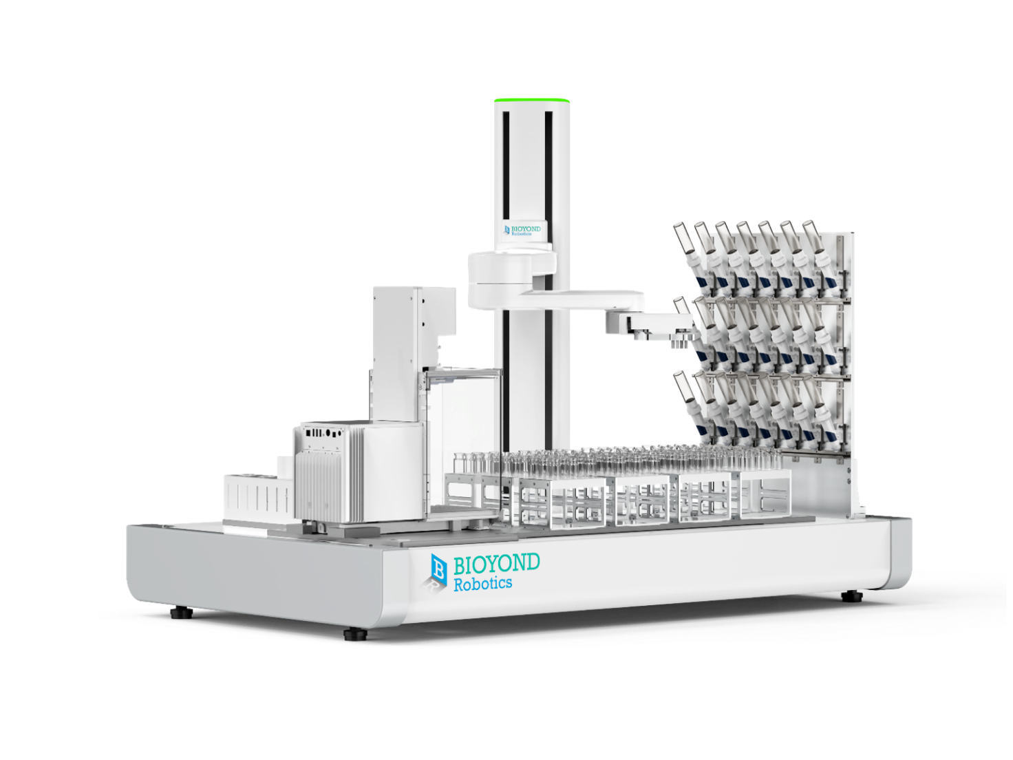 针式过滤助手主要由扫码模块、开关盖模块、移液模块、正压过滤模块,以及样品与耗材存储模块组成,能够自动化执行瓶身的扫码、开关盖、移液和正压过滤操作。