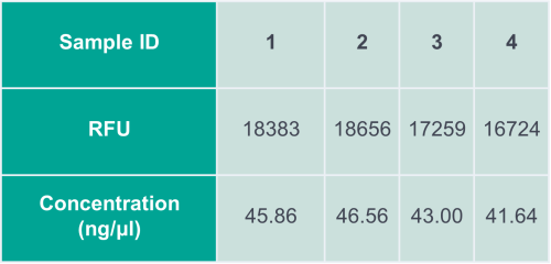 同一样本分成4份后,进行NGS自动化实验流程,洗脱后测试的浓度。
