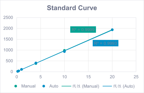 手动和自动化处理标准曲线对比,R2均大于0.999,显示了良好的线性。