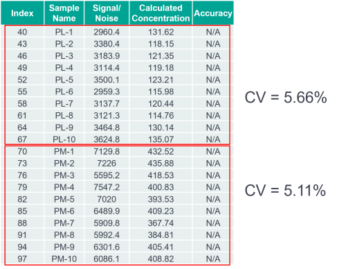多组样本进行重复定量后结果,变异系数CV<8%,实验重复性较好。