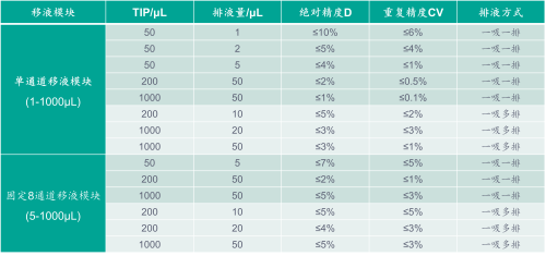LabMate Gleam系列移液助手可以配置单通道,或固定8通道的移液器,移液表现如下表所示: