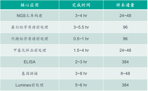 – 支持梯度稀释、浓度均一化、CherryPicking、Pooling、NGS前处理、甲基化样本前处理、代谢/蛋白组学质谱样本前处理、基因拼接、酶联免疫检测、Luminex前处理等应用。