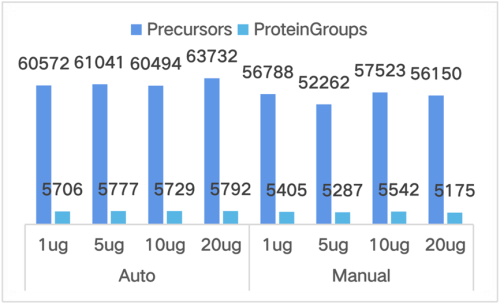 不同Hela细胞起始量,手动和自动化质谱结果对比。自动化的蛋白鉴定量和肽段鉴定量明显优于手动,且自动化结果平行性更好。