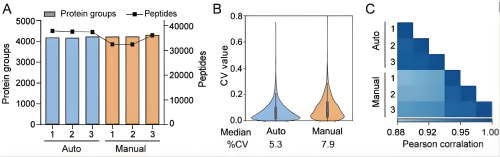进一步分析显示,自动化平台的蛋白定量变异系数(CV)中位值为5.3%,明显优于手动处理的7.9%,反映出更高的定量精度。